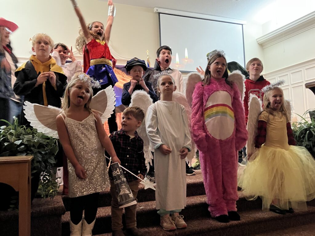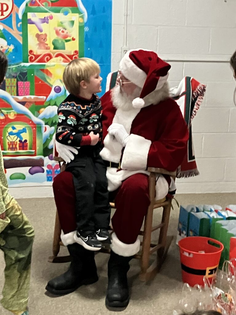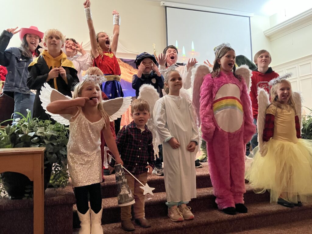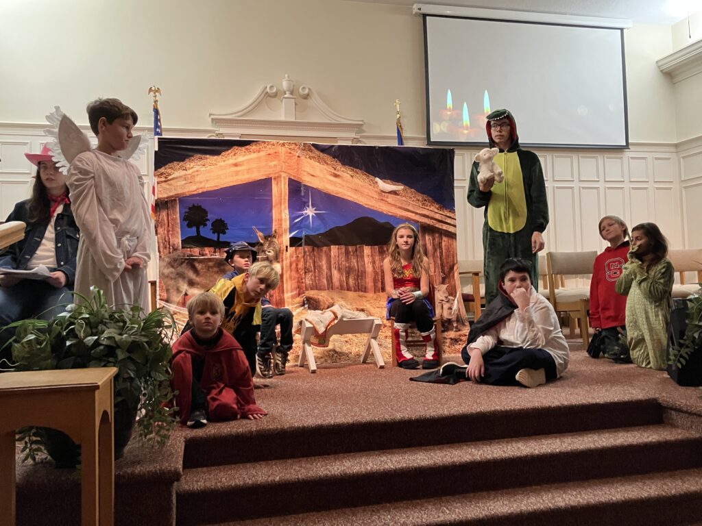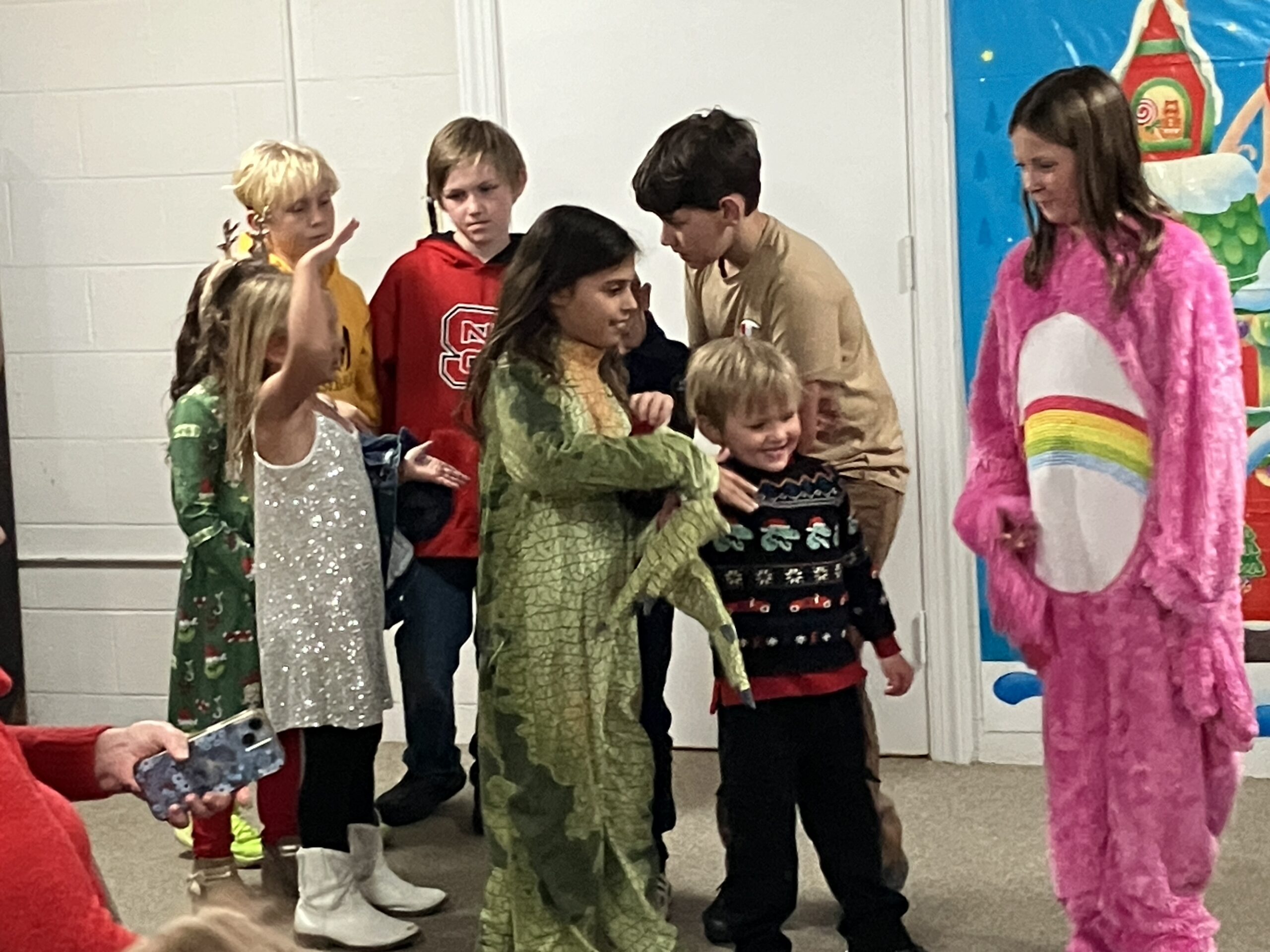 The kids and a few brave adults provided a fun and entertaining night with a play entitled The Very Mixed-Up Christmas Pageant. The kids showed up that you don’t have to wear the traditional nativity costumes to put on a Christmas program telling the story of Jesus’ birth. Mary could even ride on a dinosaur instead of a donkey. The program was followed by yummy treats, fruit and candy bags and a special visitor.